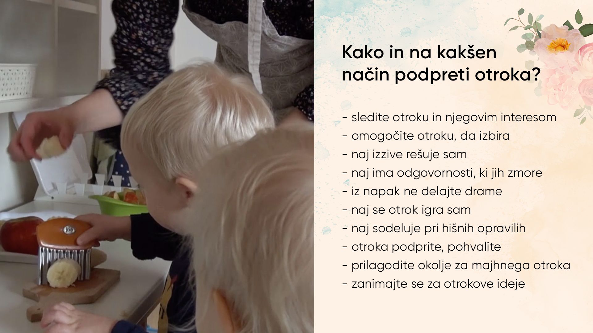 Otroci se z največjim veseljem učijo novih stvari. Pri tem potrebujejo čas in na nas je, da si vzamemo dovolj časa in jim omogočimo vajo. Starši se moramo naučiti slediti otrokovemu razvoju in njegovim interesom.